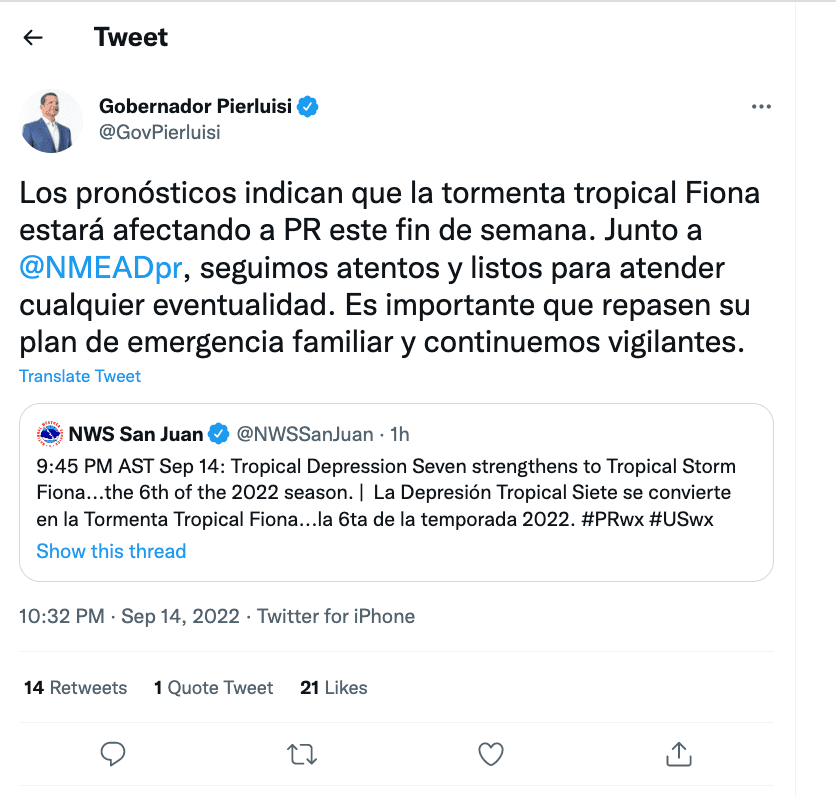 En Twitter, el gobernador escribió: "Los pronósticos indican que la tormenta tropical Fiona estará afectando a PR este fin de semana. Junto a @NMEADpr (Negociado de Manejo de Emergencias y Administración de Desastres) seguimos atentos y listos para atender cualquier eventualidad. Es importante que repasen su plan de emergencia familiar y continuemos vigilantes".