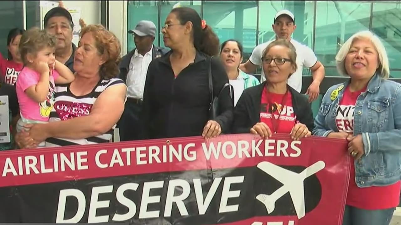 Trabajadores del servicio de alimentación exigen mejores condiciones laborales en el Aeropuerto de Los Ángeles