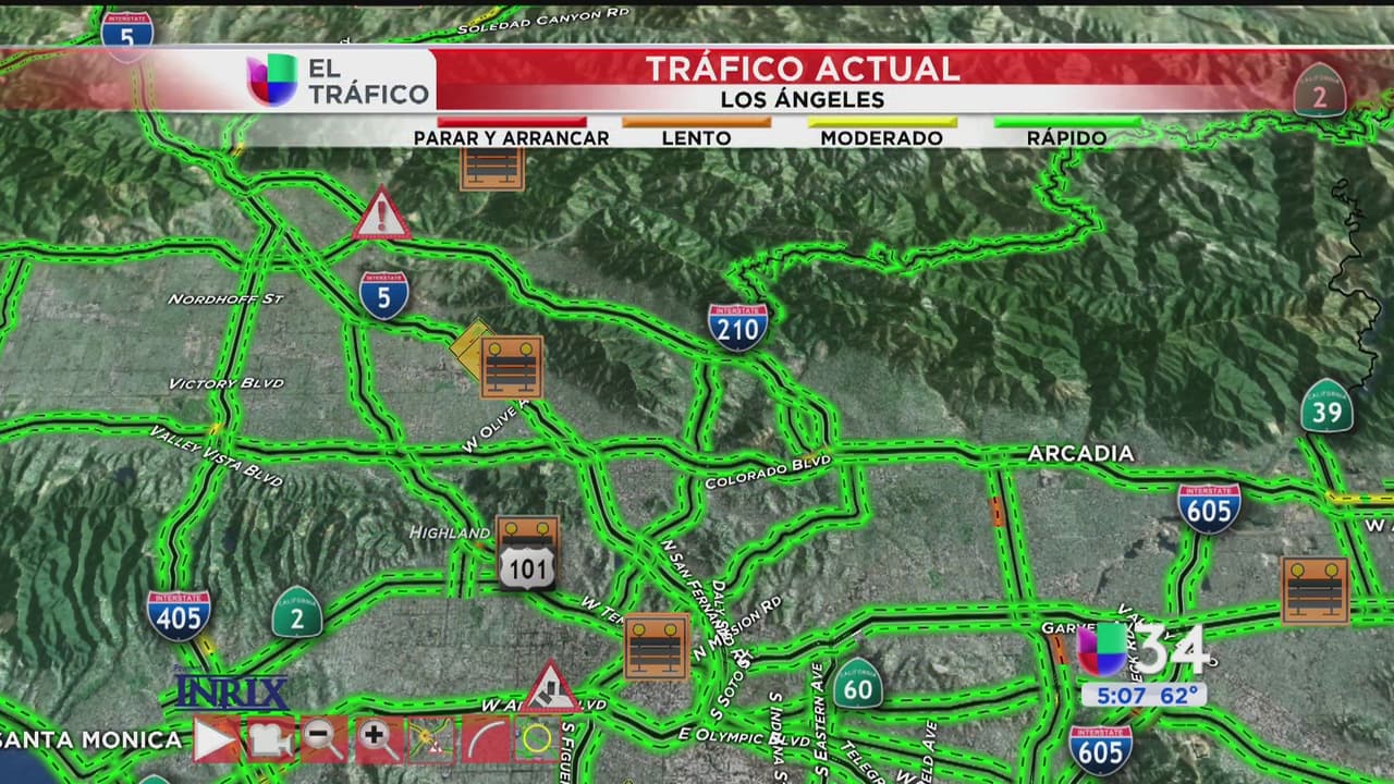 Un auto en llamas está afectando el tránsito en la 210 Este a la altura de la autopista 118. Un choque paraliza uno de los carriles de la 71 Norte.