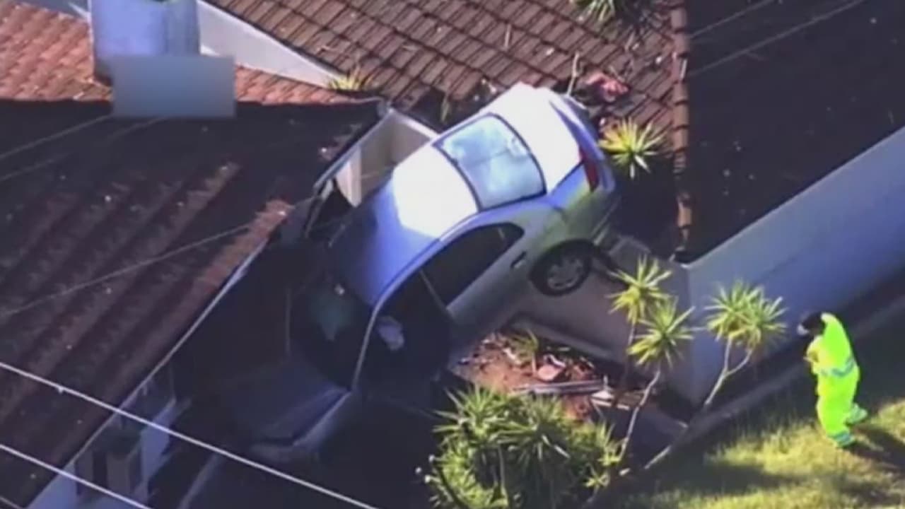 Un auto termina incrustado en el techo de una vivienda y conductor huye de las autoridades