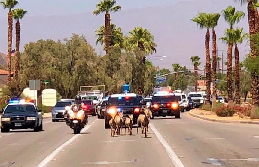 Estas ovejas de montaña se dieron un paseo por las calles del condado de Riverside en California. Los borregos cimarrones, también conocidos como ovejas de cuernos grandes, pararon el tráfico en una calle de La Quinta y agentes del alguacil las escoltaron hasta que los animales estuvieron a salvo.