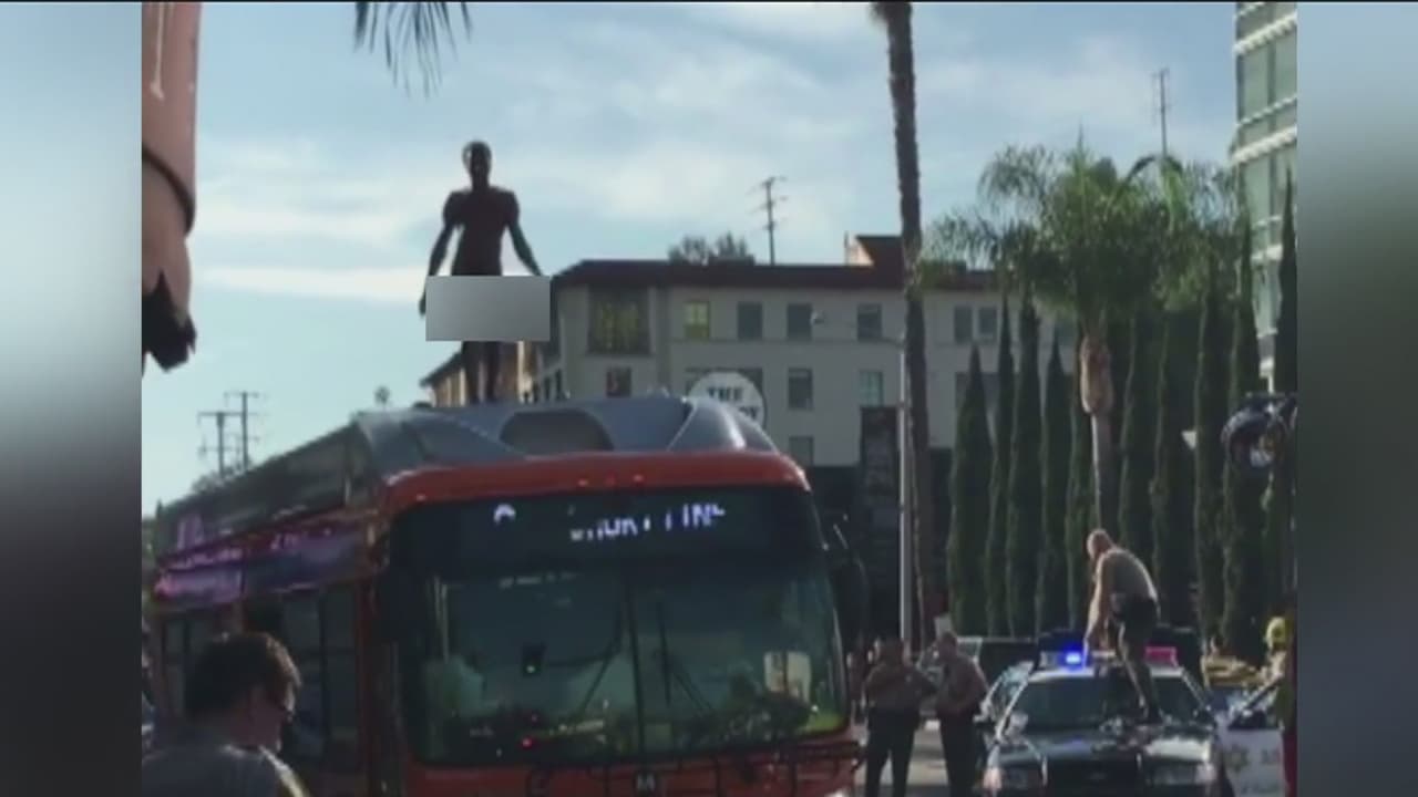 Un hombre totalmente desnudo se trepó al techo de un autobús en West Hollywood