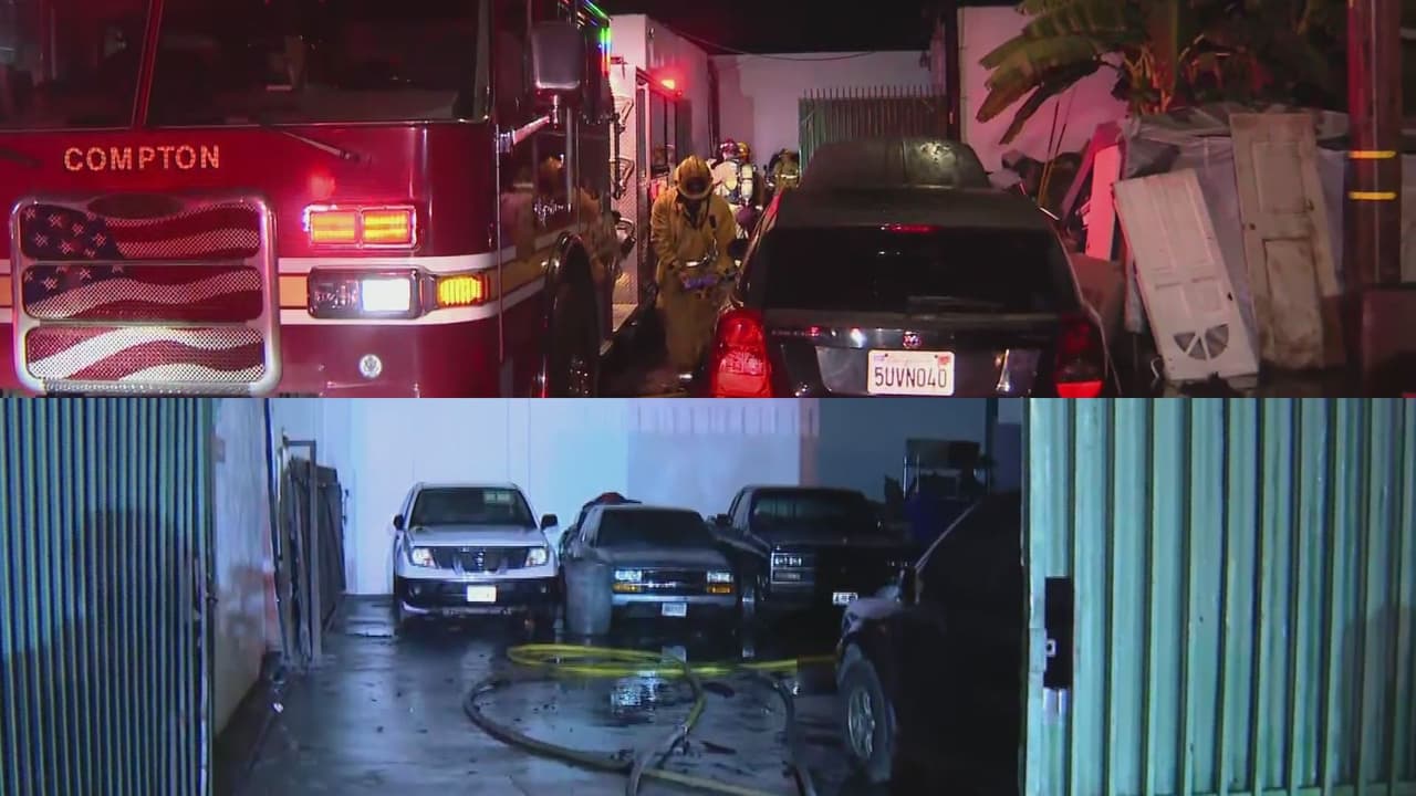 Un incendio calcina varios vehículos en un taller mecánico de Compton