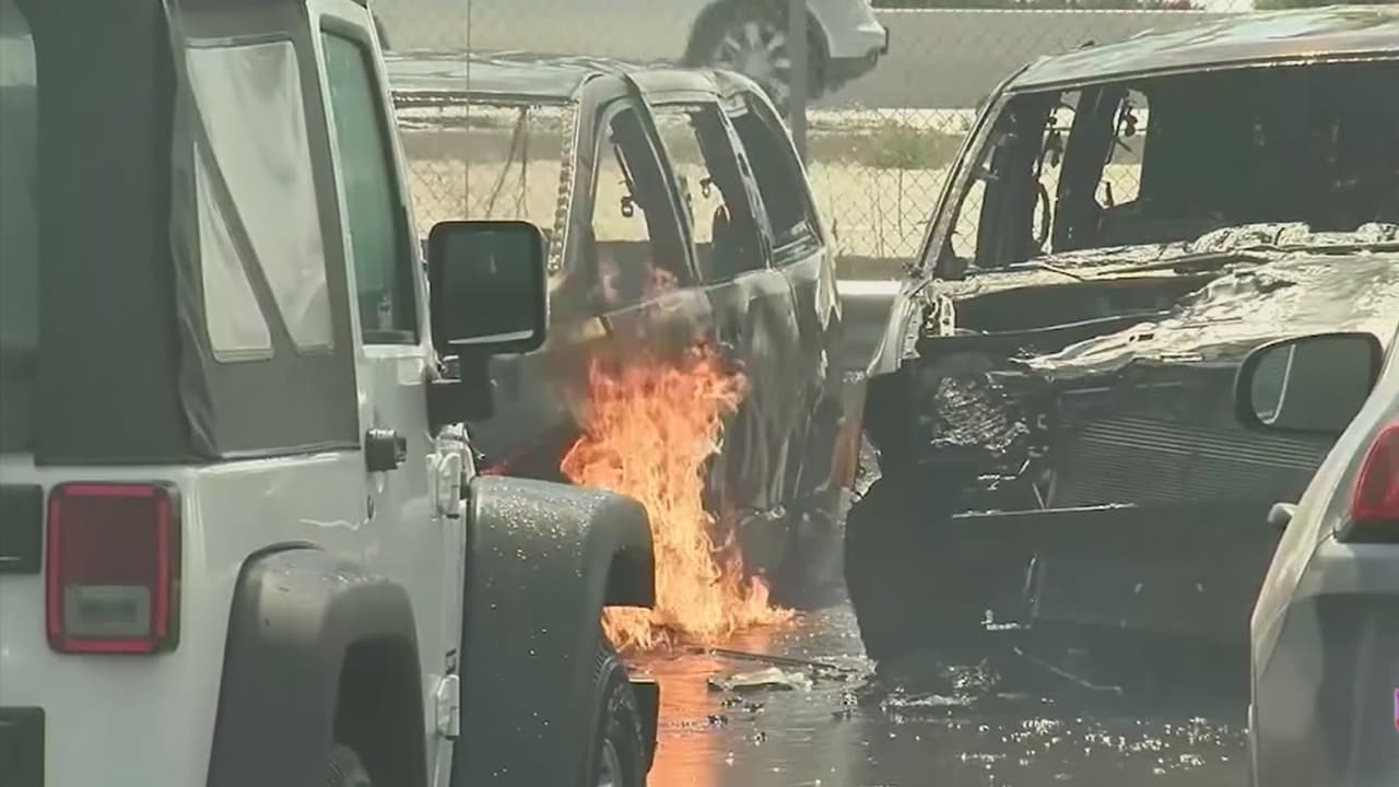 Un incendio de maleza en Bakersfield deja decenas de autos de un estacionamiento impactados por el voraz fuego