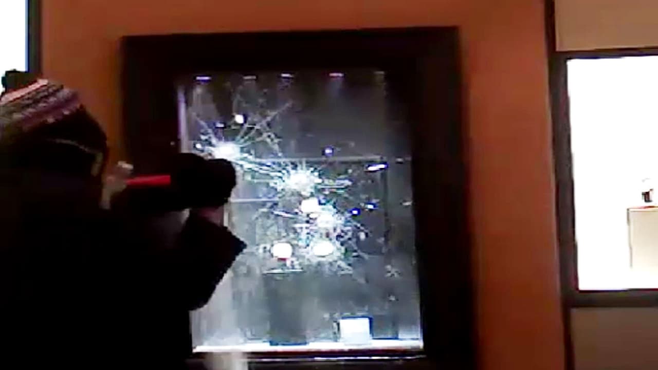 Un ladrón se vio en aprietos para romper un vidrio de seguridad de un joyería en Manhattan