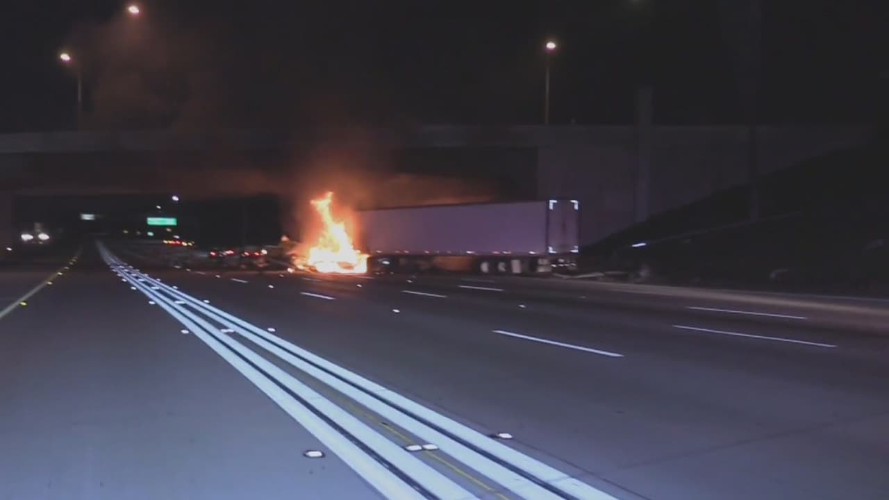 Un tráiler termina envuelto en llamas tras un aparatoso accidente de tránsito en Anaheim