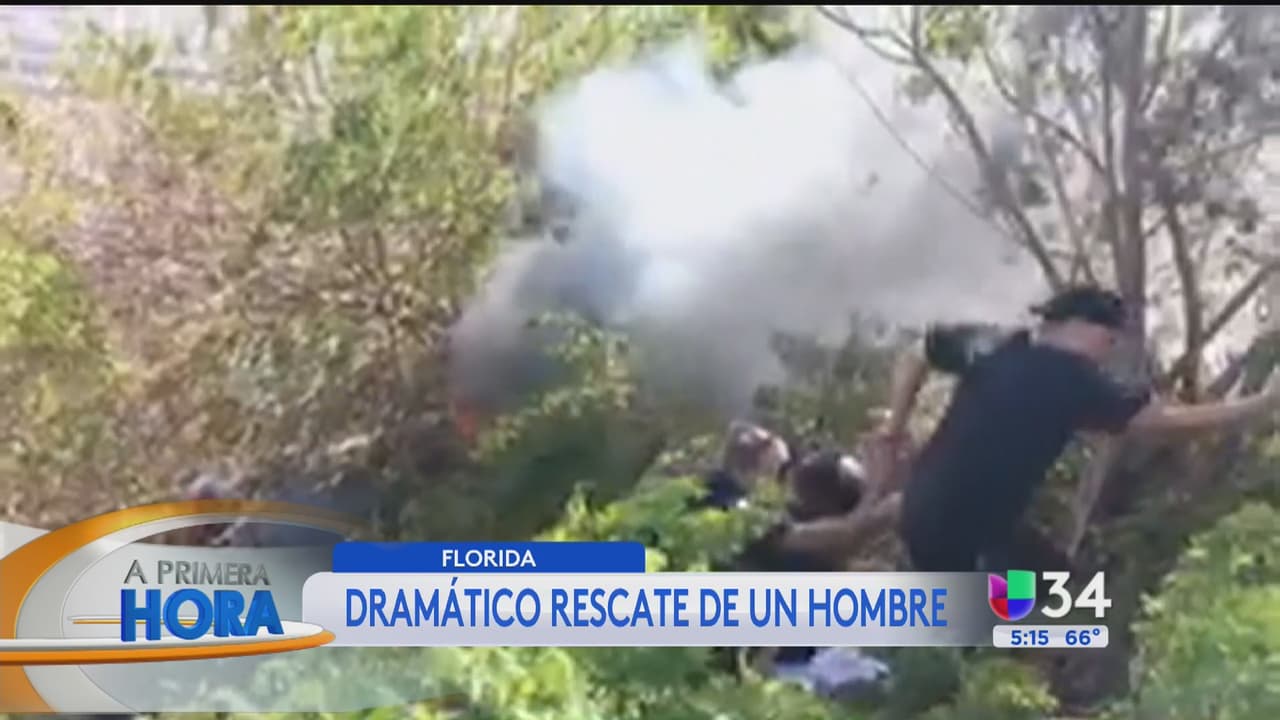 Un grupo de personas logró rescatar a un hombre que había caído cerca de un río mientras conducía y que quedó atrapado mientras el vehículo se incendiaba.