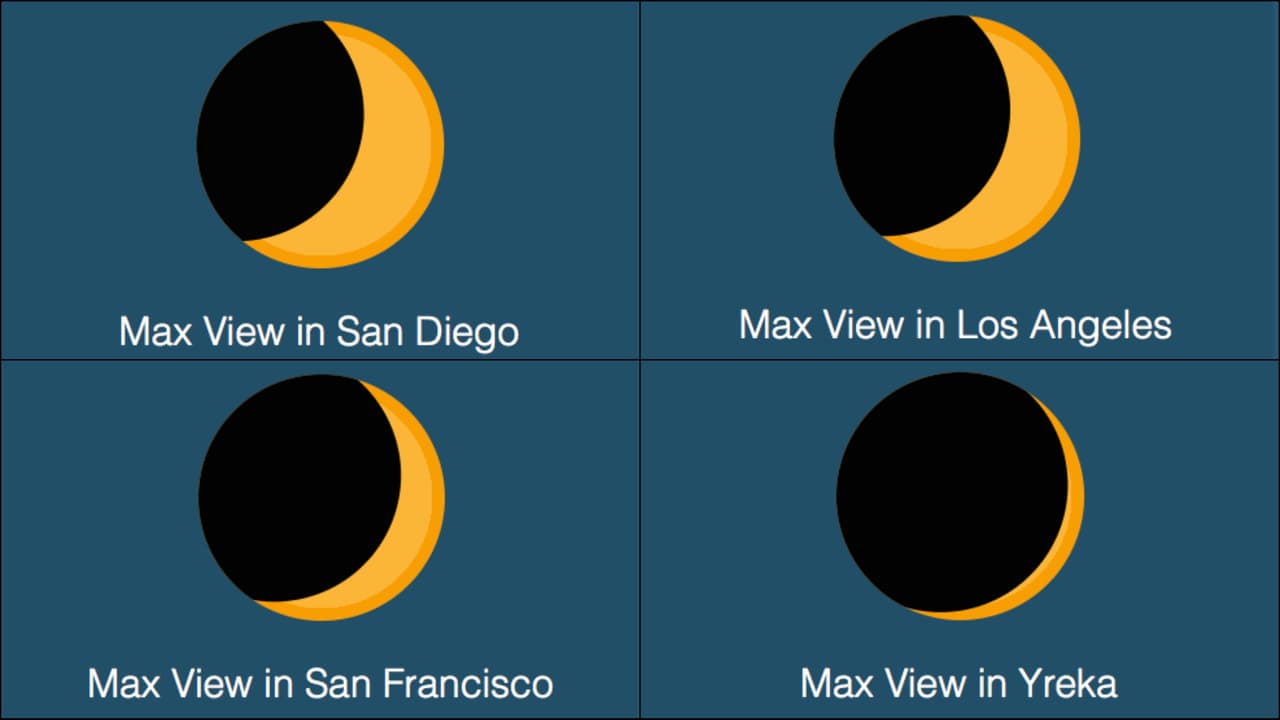 Por ejemplo, en San Diego, en el sur del estado, la Luna cubrirá el 57% de la circunferencia del Sol, mientras que en Yreka, en la frontera con Oregon, la opacidad será del 91%.