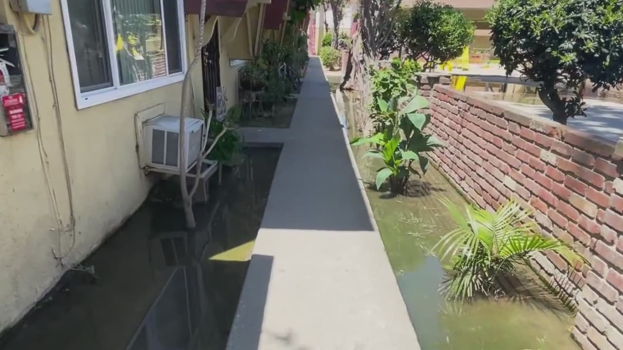 Varias familias viven rodeadas de aguas negras en Bellflower