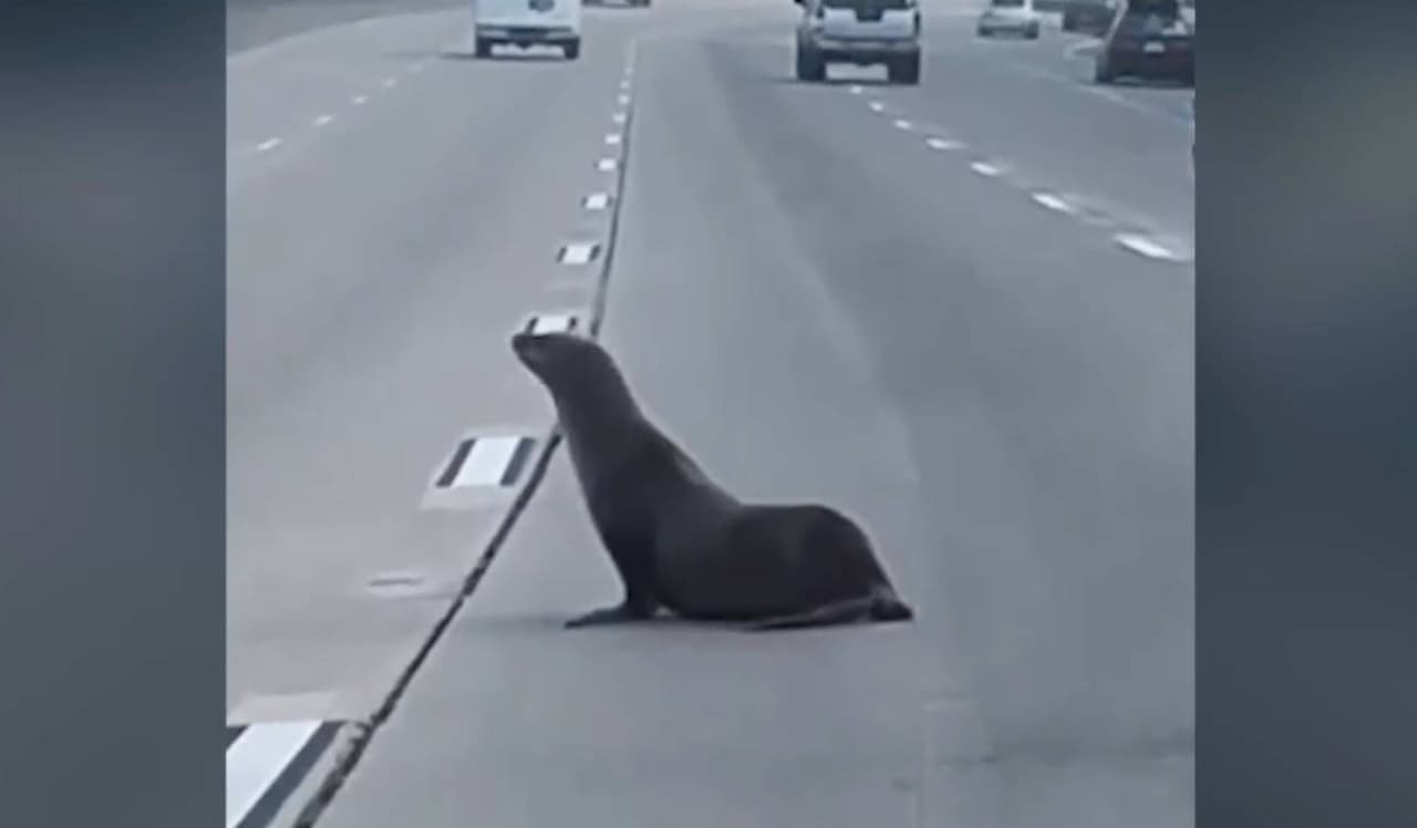 Video capta a león marino a millas del océano y parando el tráfico de autopista en San Diego