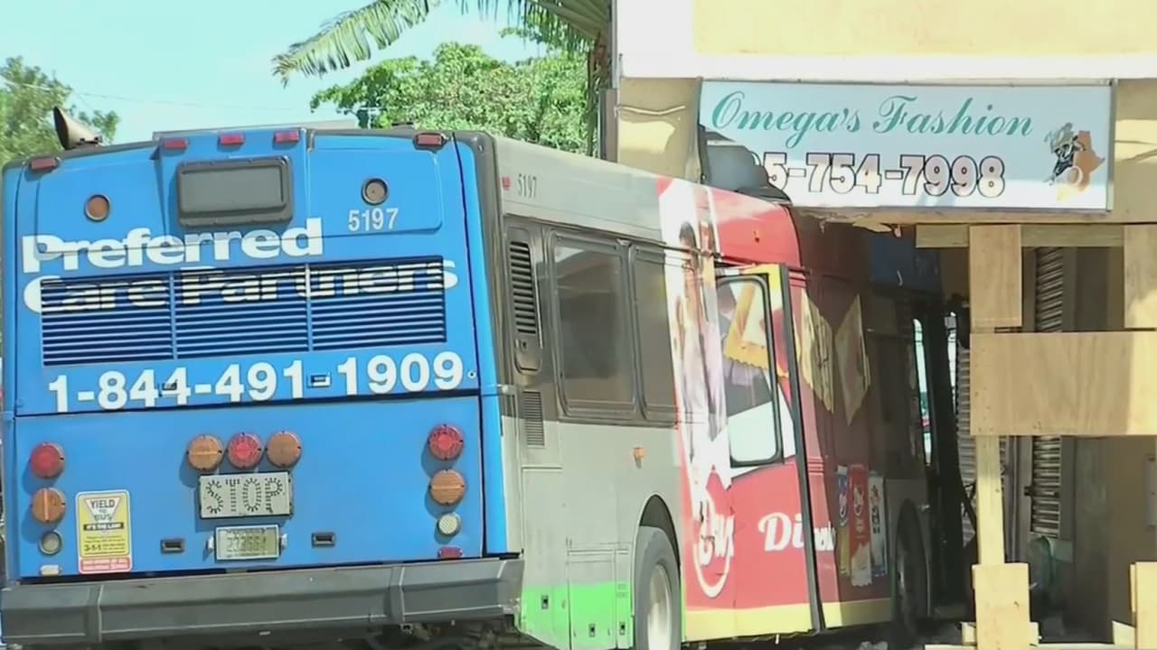 El siniestro se registró este domingo sobre las 9:45 am en el Pequeño Haití, en la ciudad de Miami. Luego del choque, el conductor del autobús perdió el control del vehículo y terminó estrellándose contra una tienda de ropa. Las dos personas que viajaban en la camioneta resultaron heridas de gravedad y fueron trasladadas a un hospital. Ocho personas más que se movilizaban en el autobús sufrieron lesiones menores.