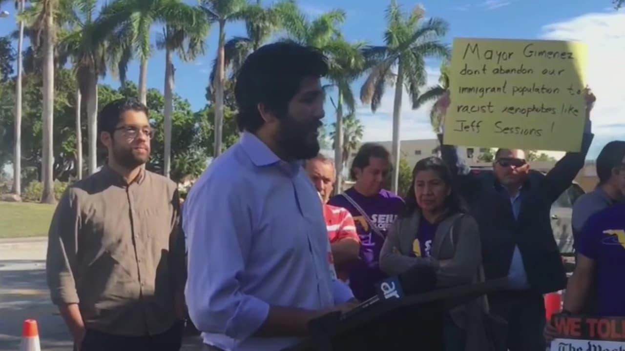 Mediante una manifestación pacífica, varios miembros de la comunidad expresaron su frustración con el alcalde de Miami-Dade Carlos Giménez, quien desde hace un año colabora con autoridades migratorias.