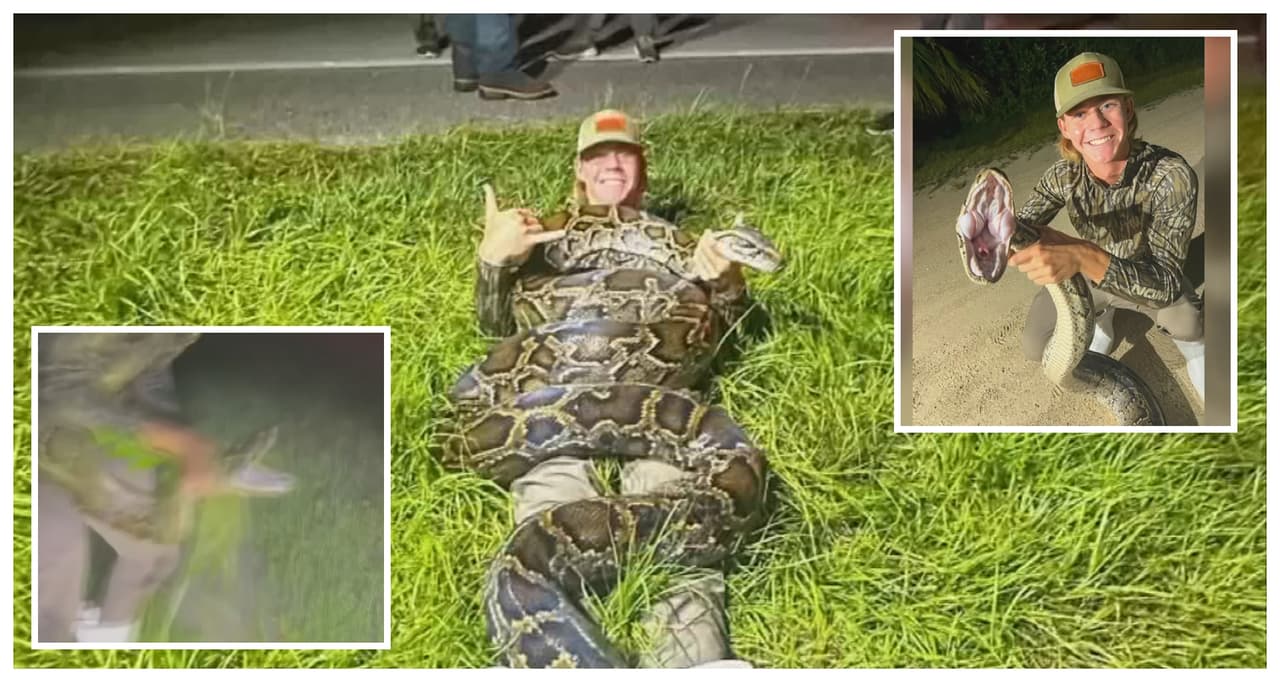 Un adolescente de 18 años de Fort Myers captura a un enorme pitón de casi 100 libras de peso y 15 pies de largo. Las pitones birmanas causan estragos en los Everglades y muchos animales han desaparecido debido al apetito insaciable de estas serpientes.