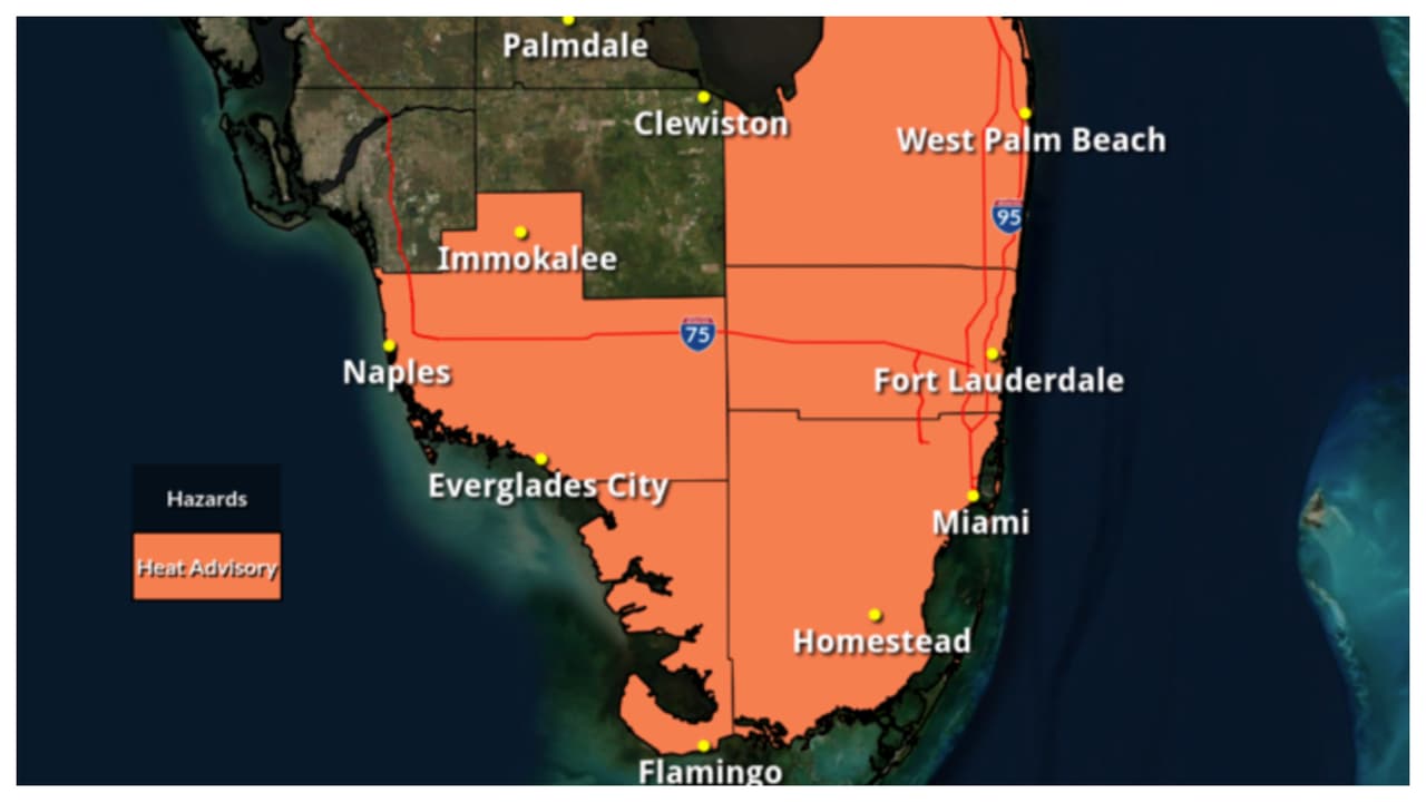 El Centro Nacional de Meteorología emitió una nueva advertencia por calor para Miami-Dade y Broward hasta las 7:00 pm, donde la sensación térmica puede alcanzar los 110 grados. Autoridades piden a quienes hagan actividades al aire libre que tomen precauciones.