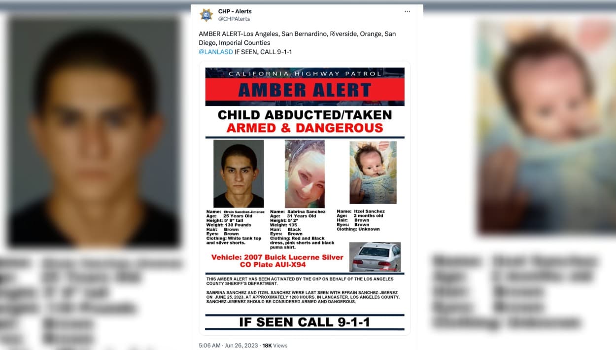 La Patrulla de Carreteras de California activó este lunes una alerta Amber por la bebé de dos meses de nacida Itzel Sánchez. La menor, al igual que su madre, Sabrina, fueron vistas el domingo por última vez. Supuestamente, Efraín Sánchez, padre de la bebé, se las llevó bajo amenaza y se presume que el hombre está armado.