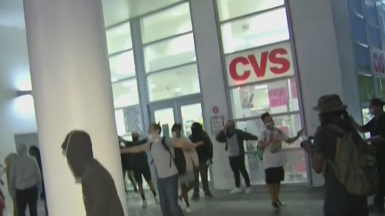 Algunos manifestantes tratan de vandalizar un CVS en Miami durante las protestas de este domingo