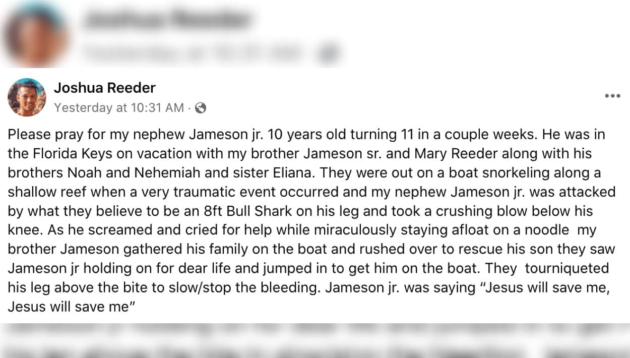 El sábado 13 de agosto, pasado el mediodía, salieron en un bote a bucear a la concurrida zona de Looe Key. Estuvieron disfrutando un rato, cuando Jameson Reeder Jr. comenzó a llamar la atención a gritos. Dijo que lo mordió un tiburón.
