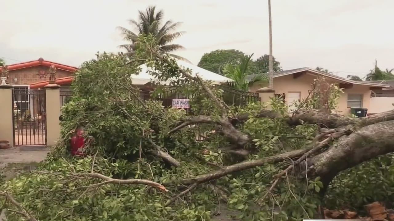 Árbol cae sobre un auto como consecuencia de las fuertes lluvias y ráfagas de viento en Miami-Dade