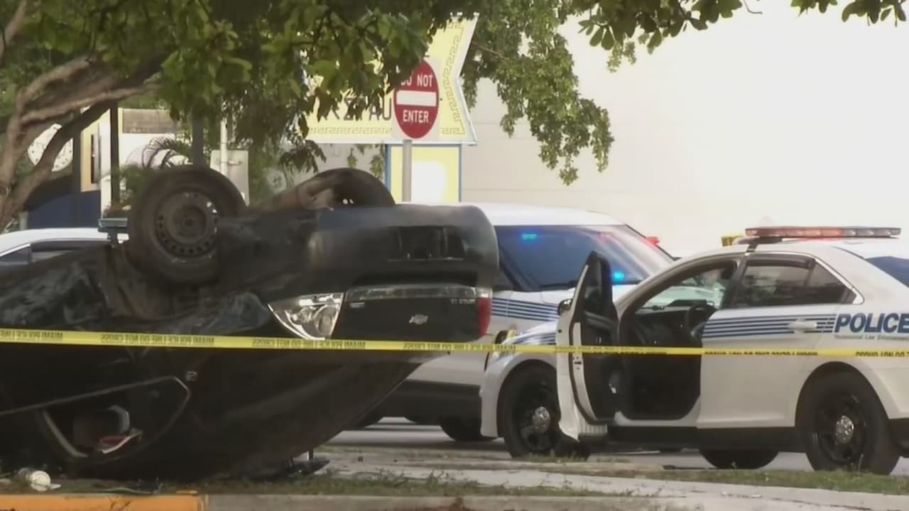 El accidente ocurrió la mañana de este jueves en la US-1 y la avenida 17, cuando un automóvil cruzó un semáforo y golpeó a dos motociclistas. El chofer huyó de la escena, pero fue detenido minutos después mientras aparentemente trataba de quitarle la placa a su vehículo.