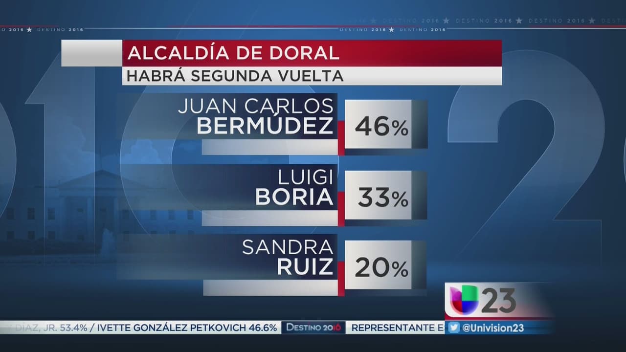 Dos alcaldías de Miami Dade que irán a una segunda vuelta son Doral y Miami Lakes. Ninguno de los candidatos a la alcaldía de estas ciudades alcanzó el mínimo requerido (50% más uno) por ley para proclamarse ganador.