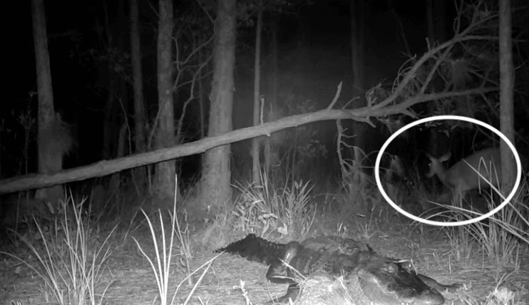 Ten cuidado por donde caminas en la noche, este hombre se encontró a un enorme caimán merodeando a este ciervo, en Florida. Aunque él veía nada por la oscuridad, logró detectarlos, sin que los animales se dieran cuenta de su presencia.