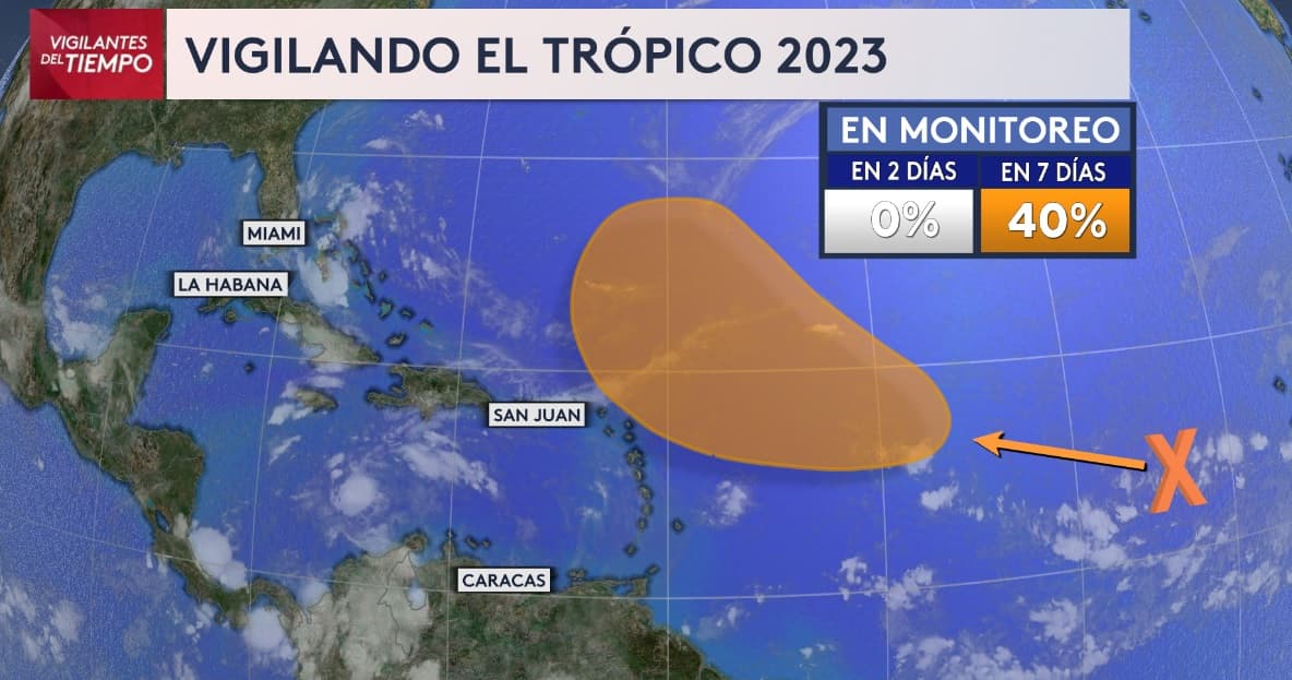 El Centro de Huracanes ha elevado a un 40% la probabilidad de formación de un ciclón dentro de una fuerte onda tropical en el Atlántico. Esta onda o zona de mal tiempo, se mueve hacia los mares al norte de las Antillas y cerca del Caribe Oriental.