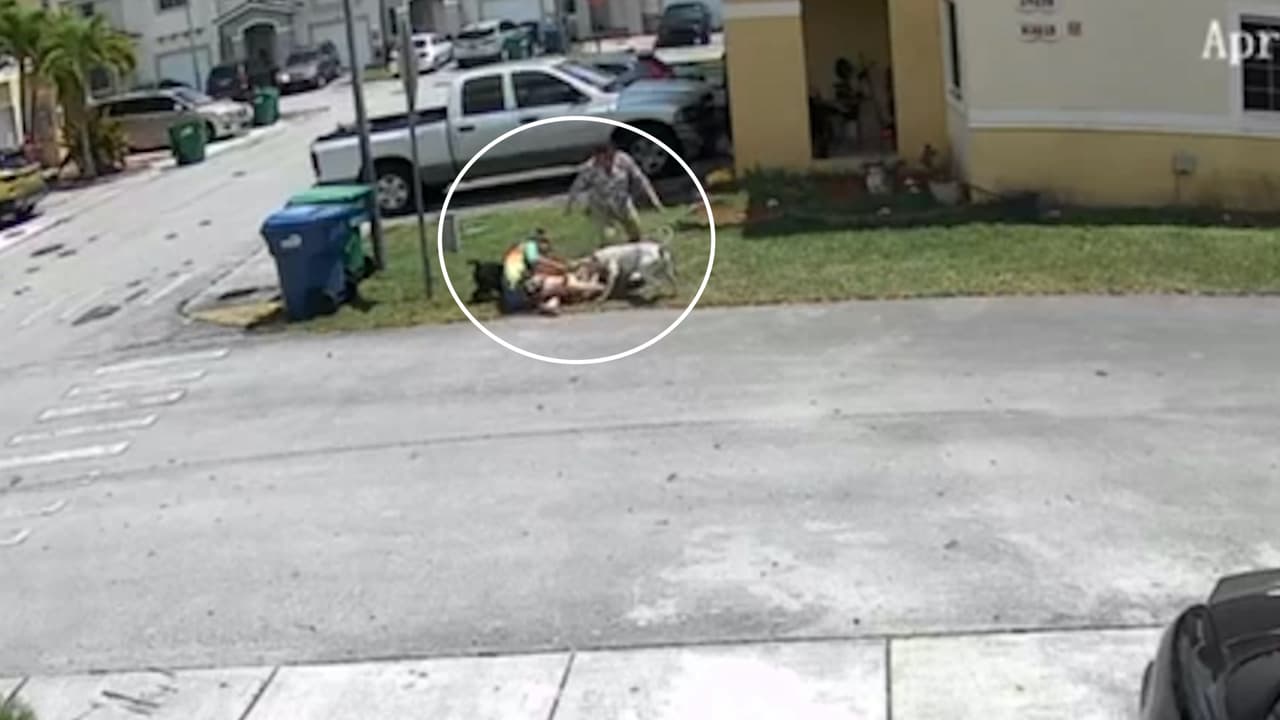 Una violenta pelea entre dos American Bulldog y varios vecinos quedó captada por la cámara de seguridad de una comunidad en Homestead. Los animales atacaron e hirieron a una mujer y a su mascota. En otro incidente previo, mataron a otro perrito.