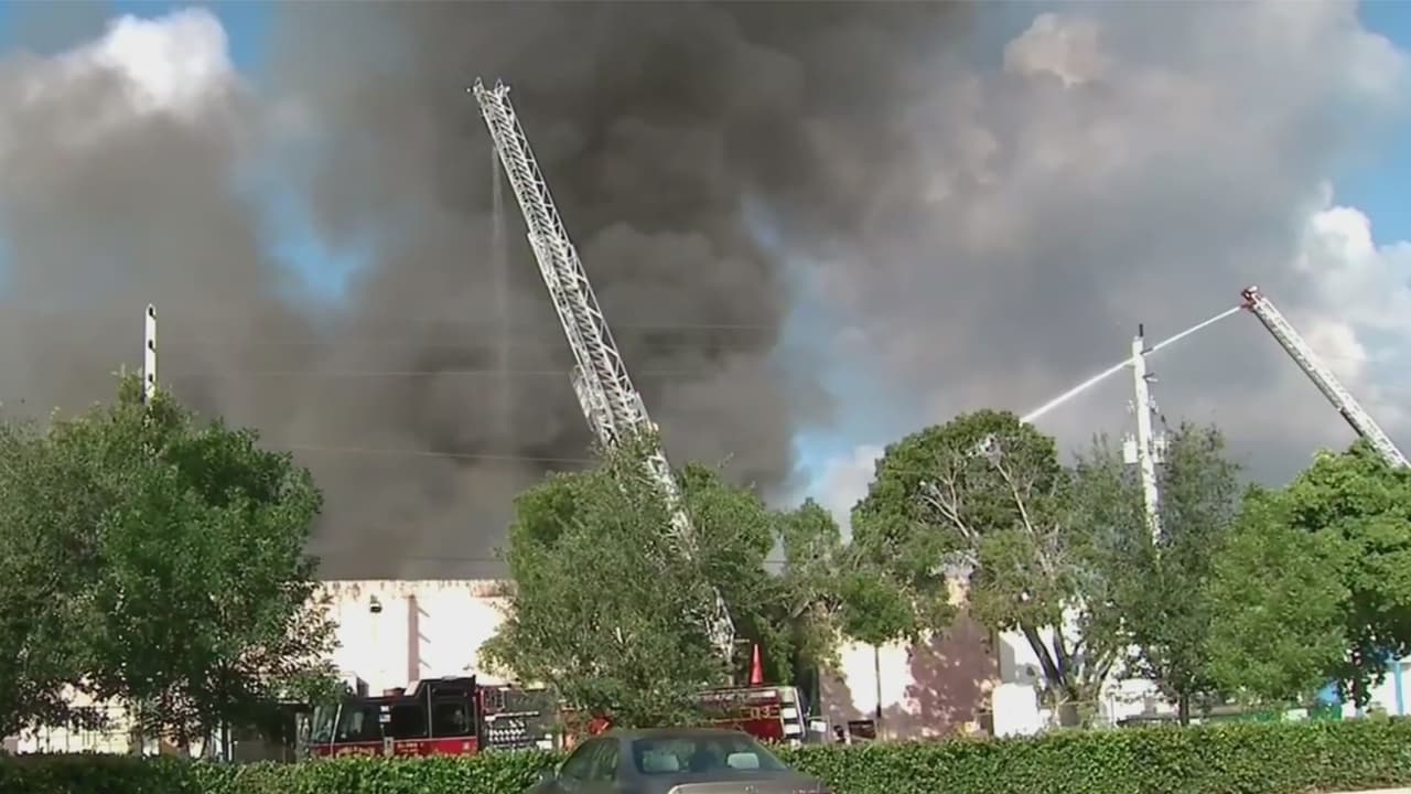 Bomberos luchan durante horas contra un voraz incendio en una fábrica en Hialeah