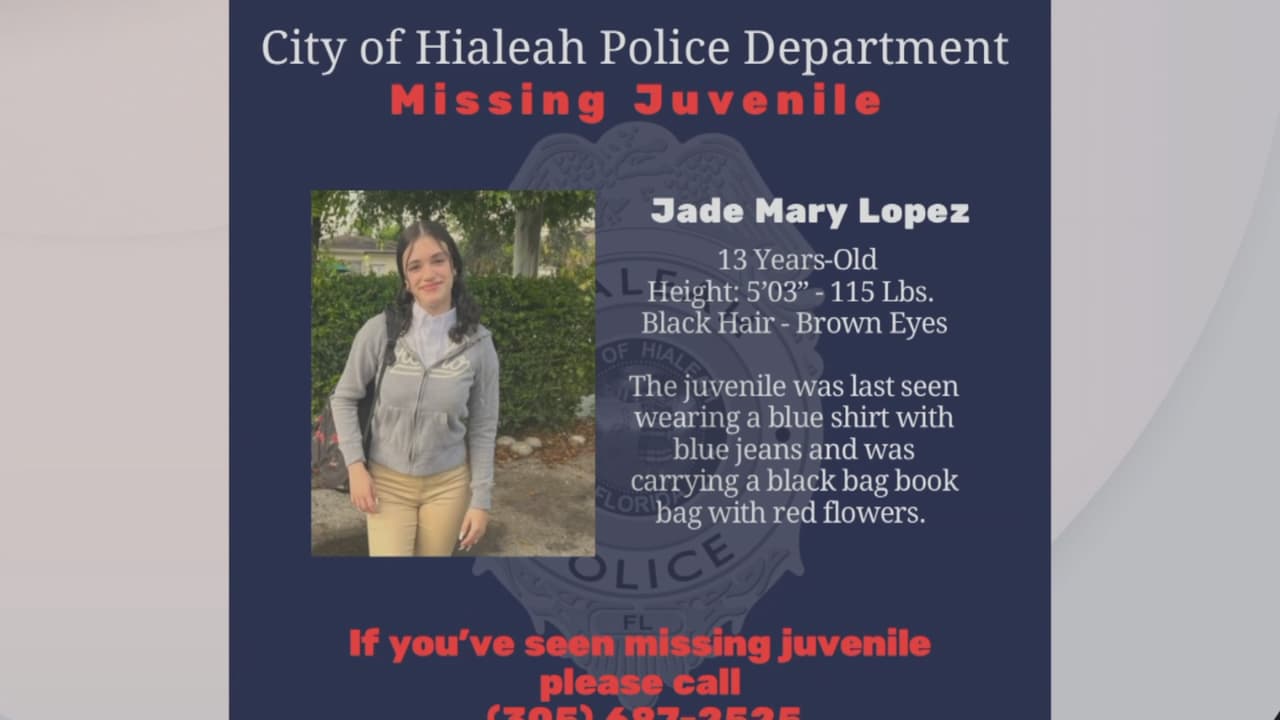 La policía de Hialeah busca a una adolescente de 13 años desaparecida. Jade de Mary Lopez mide 5 pies 3 pulgadas y pesa 115 libras, tiene el cabello negro y los ojos marrones. Jade fue vista por última vez en el área de la avenida 4 y la calle 13 del este.