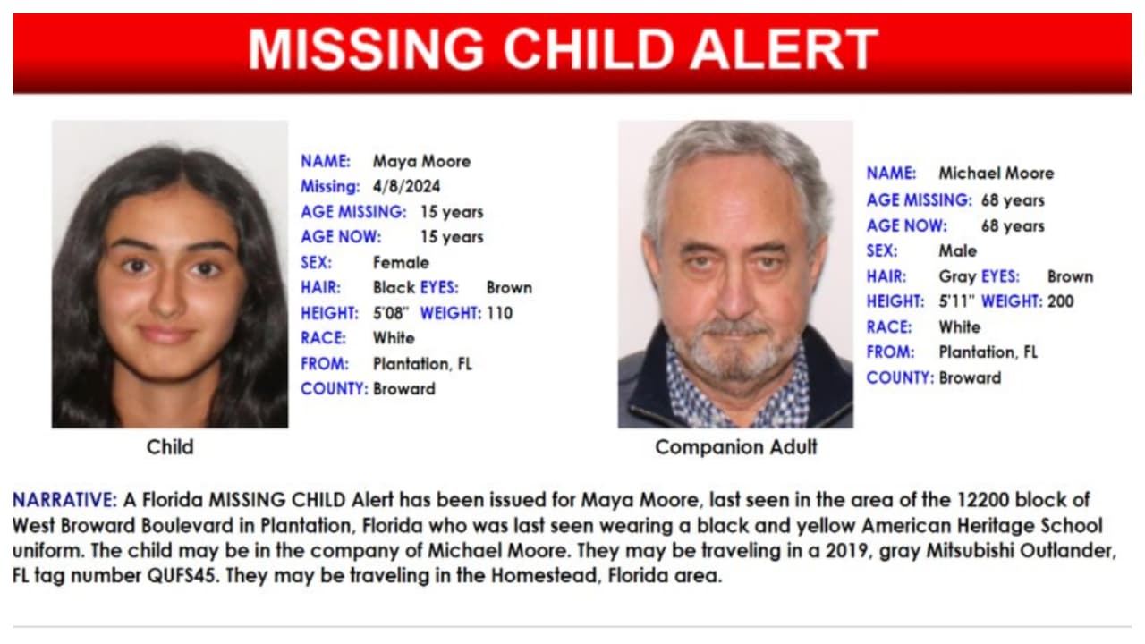 El Departamento del Cumplimiento de la Ley de Florida activó una alerta de búsqueda por la adolescente de 15 años Maya Moore, quien fue vista por última vez en Plantation. La menor podría estar en compañía de Michael Moore, un hombre de 68 años, en el área de Homestead en una camioneta Mitsubishi Outlander, de placas QUFS45. Piden a quien tenga información que se comunique con la FDLE al 1-888-356-4774 o al 911.