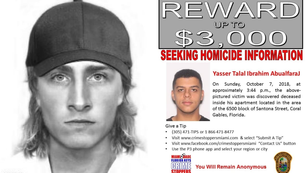 El Departamento de Policía de Miami-Dade publicó un boceto de la persona que, según afirman, estuvo involucrada en "un incidente sospechoso" en el apartamento donde el universitario Yasser Talal Ibrahim Abualfaraj, de 23 años de edad, fue encontrado muerto el domingo.