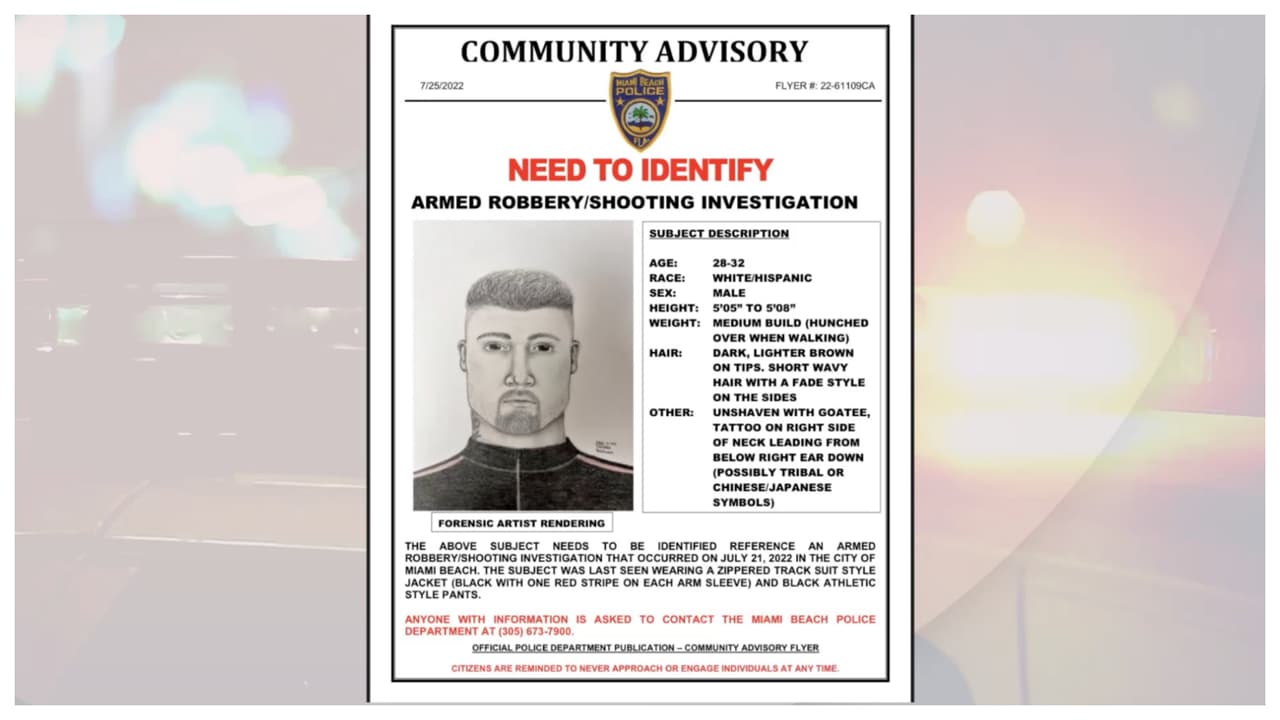 La policía de Miami Beach está buscando a un hombre acusado de robar y disparar a un joven de 25 años, quien se encuentra en estado de coma y luchando por su vida en un hospital.