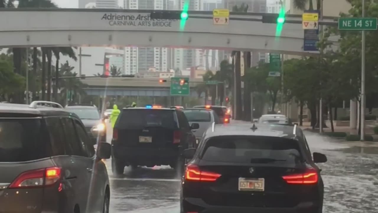 Calles inundadas y gran congestión vial por fuertes lluvias en el sur de Florida
