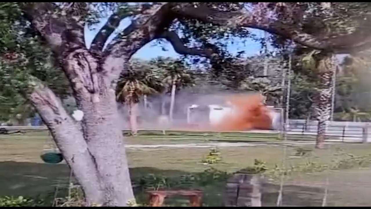 La Patrulla de Carreteras de Florida publicó el video del momento en que un camión cisterna se vuelca, derramando 1,300 galones de aceite de cocina en la vía. Las impresionantes imágenes muestran también cómo los dos ocupantes del vehículo salen lanzados fuera del vehículo.