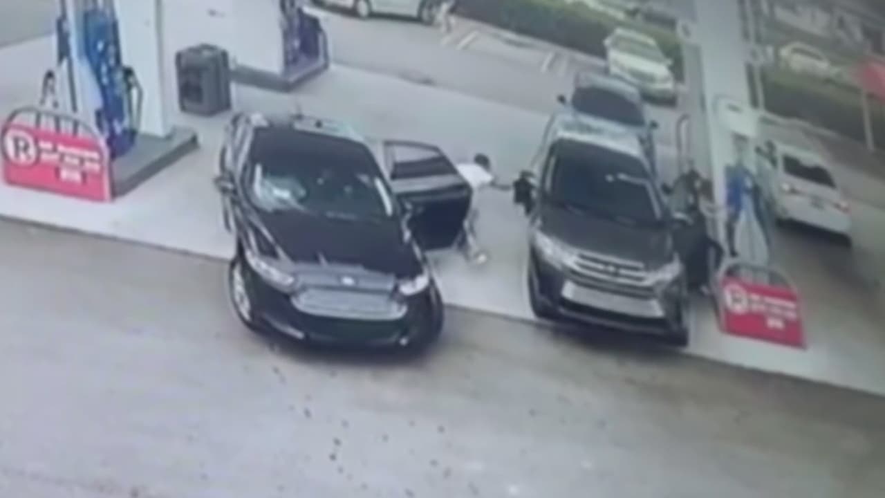 En cámara quedó un individuo cuando le robaba la cartera del vehículo a una mujer en una gasolinera en Doral. Las imágenes muestran cuando el sospechoso baja de la parte del pasajero de otro automóvil, abre la puerta del vehículo donde viajaba la mujer, que lo había dejado sin seguro, y se roba su cartera.