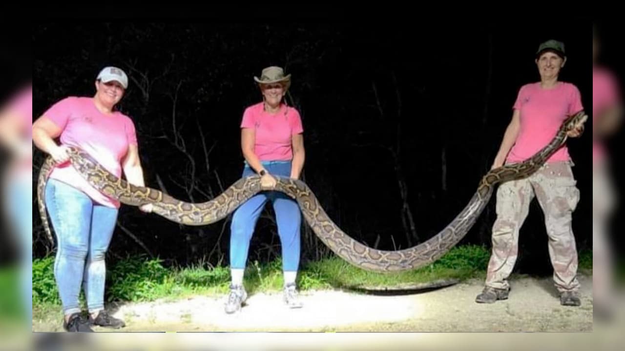 La enorme pitón que medía 16 pies y pesaba 91 libras fue capturada y eliminada por tres mujeres en los Everglades del sur de Florida. El trio de cazadoras profesionales se hace llamar las "Everglade Avengers".
