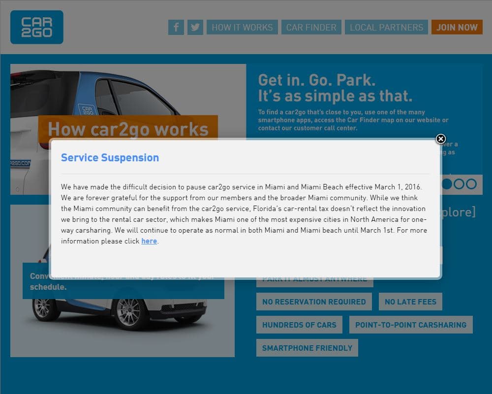"Aunque creemos que Miami se puede beneficiar grandemtne de servicios como Car2go, el impuesto de carros de alquiler de Florida no refleja la innovación que traemos al sector de alquiler de autos", decía una comunicación enviada por correo electrónico a los usuarios.