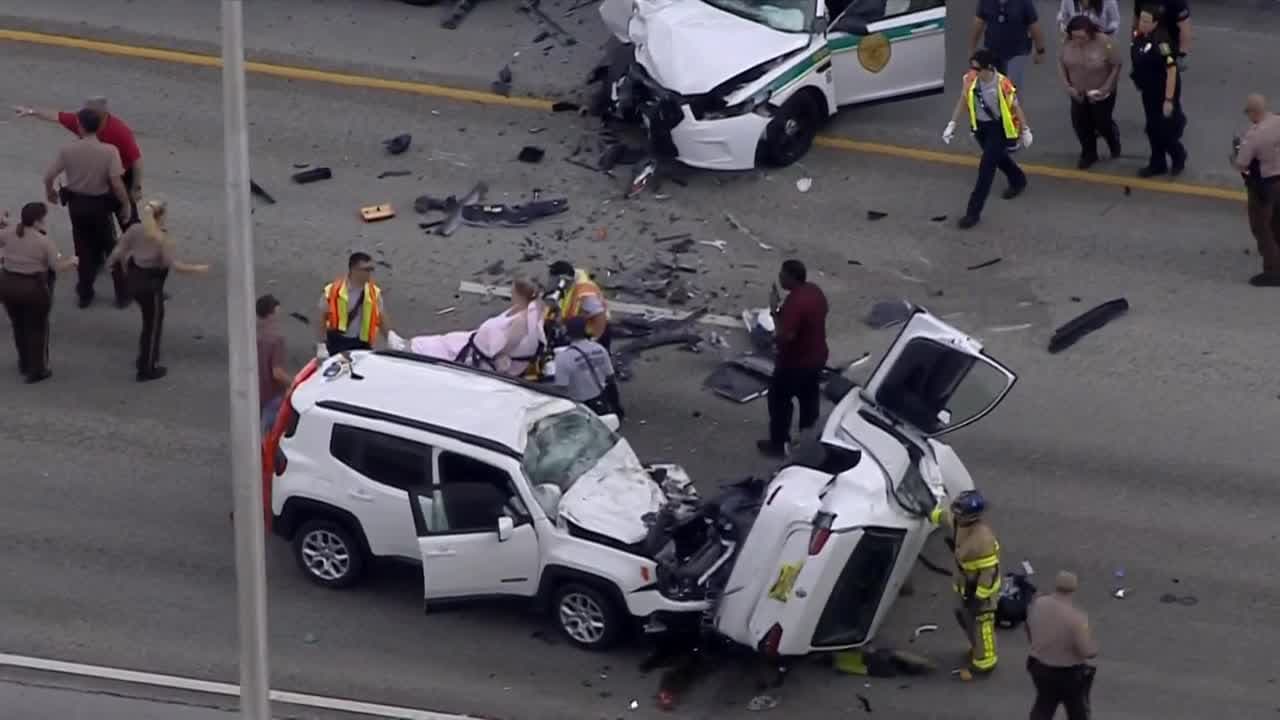 El choque ocurrió aparentemente cuando un vehículo iba en sentido contrario, a la altura de Killian Parkway. Al menos una persona quedó atrapada en uno de los vehículos y un oficial resultó herido. Autoridades advierten evitar el área.