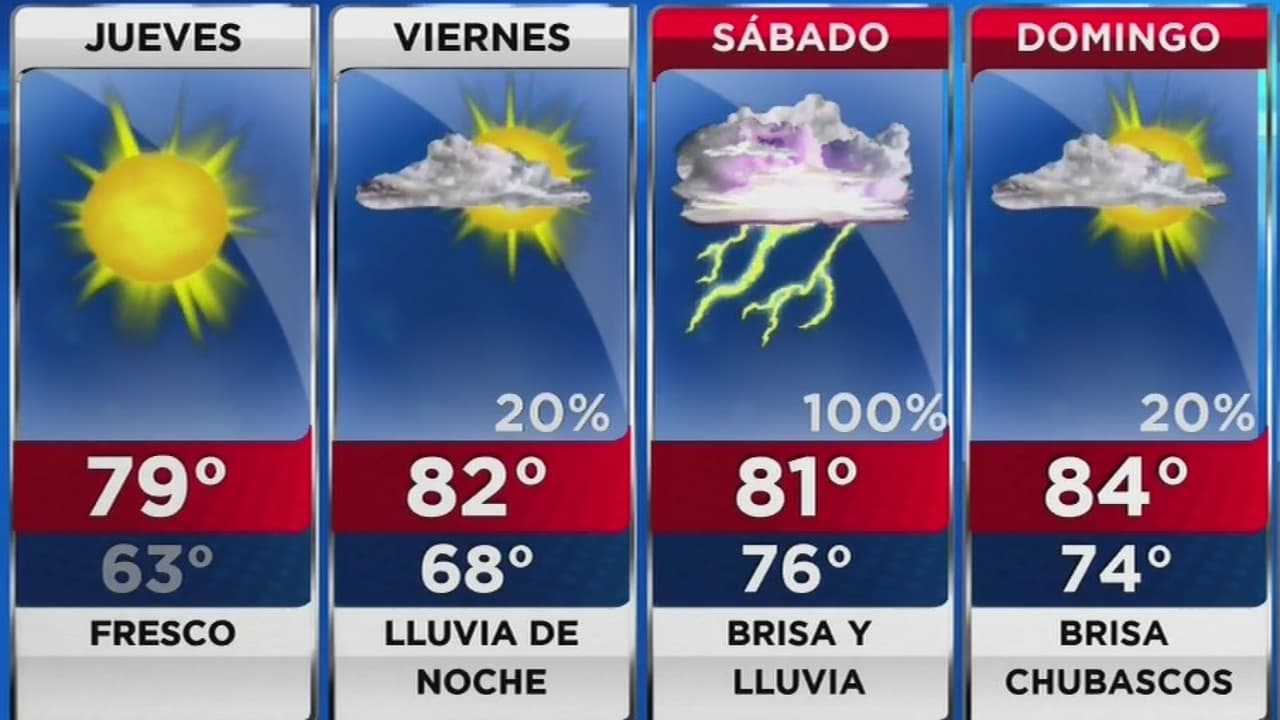 Después de varios días de lluvia, este jueves será soleado, despejado y seco. La máxima temperatura será de 79 grados, con viento calmado. Hay baja probabilidad de lluvia.