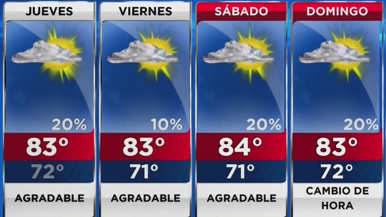 La temperatura máxima para este jueves alcanzará los 83 grados. Será un día de viento calmado, aunque con una baja probabilidad de llovizna en algunas zonas. El cielo se verá ligeramente nublado.