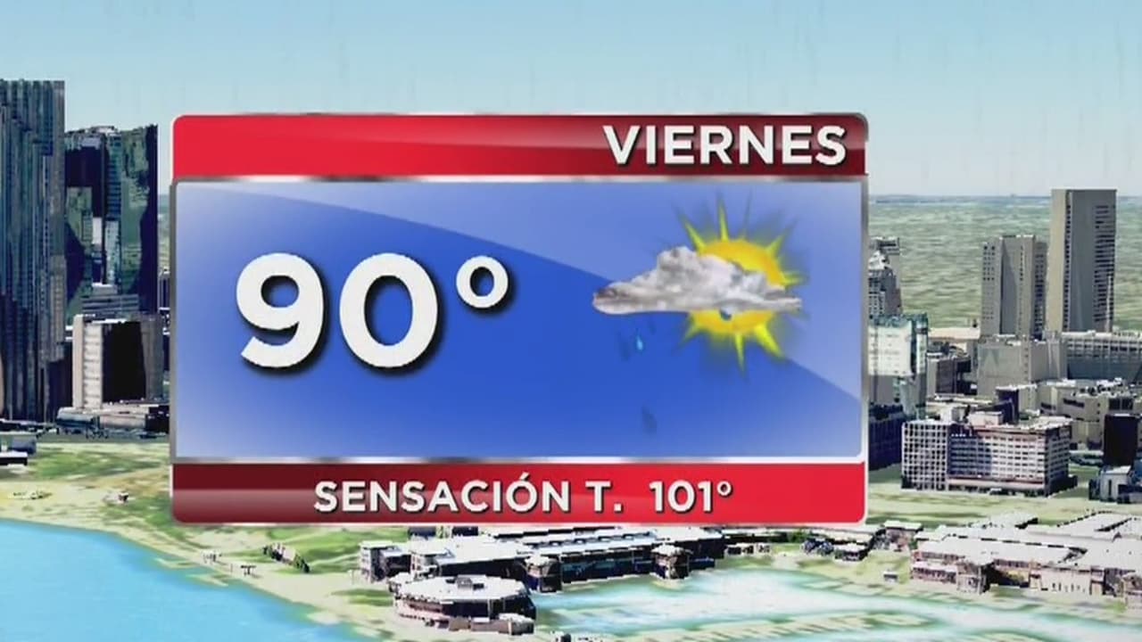 Sigue el calor en la ciudad de Miami y sus alrededores, a pesar del viento ligero y las posibilidades de chubasco. La temperatura máxima será de 90 grados, con sensación térmica de 101 grados.