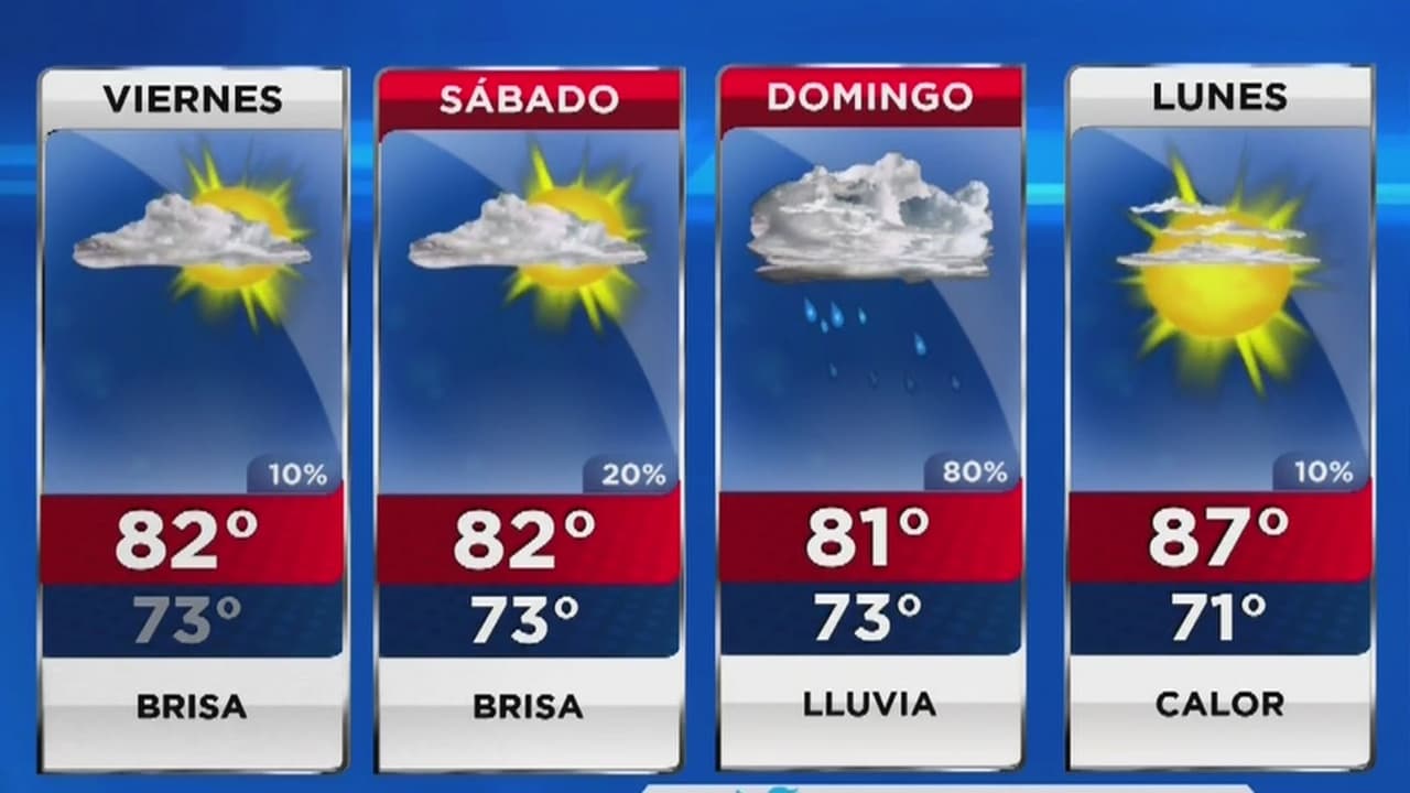 Las autoridades mantienen la alerta de corrientes de resaca en las costas. La temperatura máxima para este viernes será de 82 grados, y la mínima de 73 grados. Las condiciones del tiempo serán muy similares el sábado.