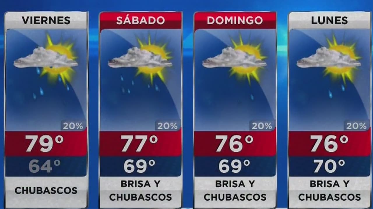 Aunque la temperatura sigue subiendo, aún no se estabiliza. La máxima para este día será de 79 grados, y la mínima llegará a 64 grados, con posibilidades de lloviznas. Los días lluviosos se extenderán durante el fin de semana.