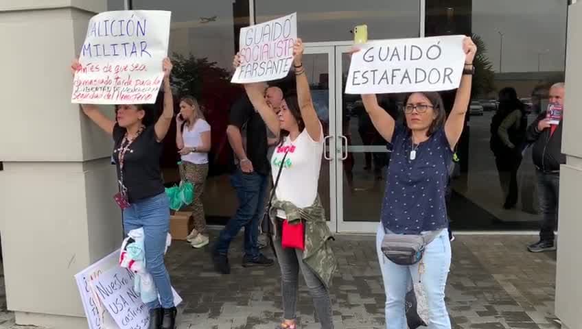 Unas mujeres protestaron en el evento en donde el presidente interino de Venezuela Juan Guaidó se reúne con el exilio de su país, en donde pidieron una intervención militar en la nación suramericana. Además, cargaron pancartas que decían “Guaidó Socialista Farsante.”