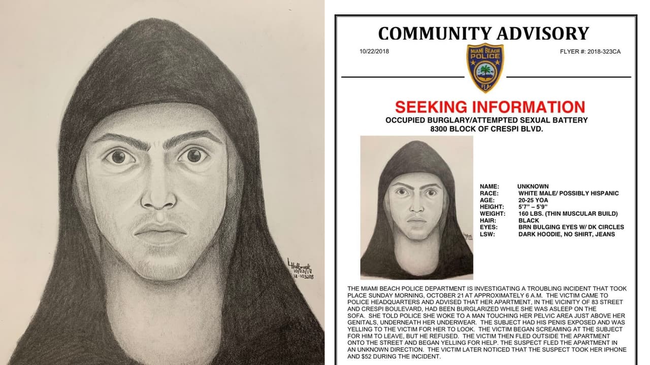 El Departamento de Policía de Miami Beach publicó este martes el boceto de un sujeto señalado de intentar asaltar sexualmente a una mujer mientras esta dormía en su residencia. De acuerdo con las autoridades, el sospechoso huyó del lugar con dinero en efectivo y un celular de la víctima.