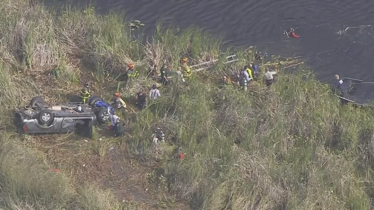 De acuerdo con la investigación de la autoridad de carreteras de Florida, al vehículo, un Nissan Frontier, se le estalló una llanta mientras andaba, saliéndose de la calle y volcándose varias veces antes de detenerse cerca al canal.