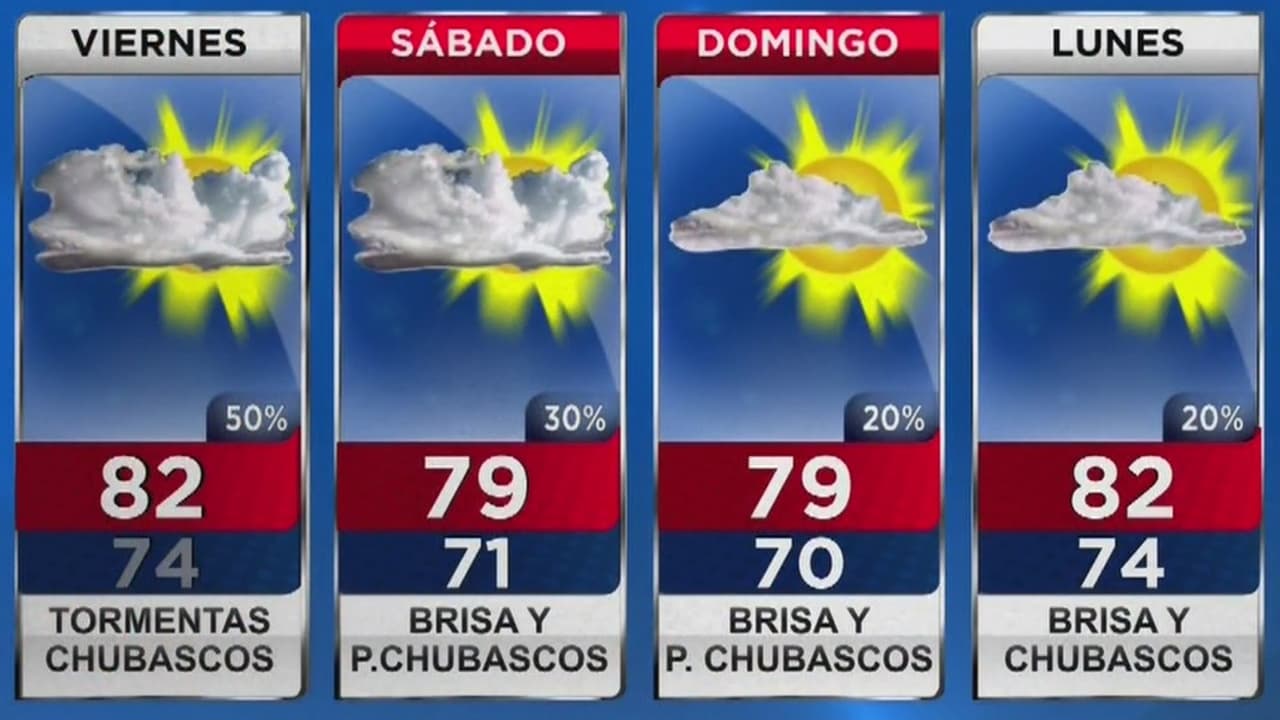 Hay posibilidad de que las precipitaciones continúen durante el fin de semana, debido a los vientos presentes en la zona. La máxima temperatura durante este día será de 82 grados, mientras que la mínima llegará a los 74 grados.