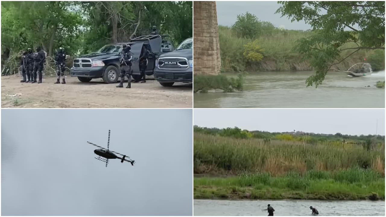 Decenas de agentes uniformados están apostados cada 100 metros, a la orilla mexicana del río Bravo y se unen a la vigilancia por aire, que también realiza un helicóptero de las autoridades de EEUU.