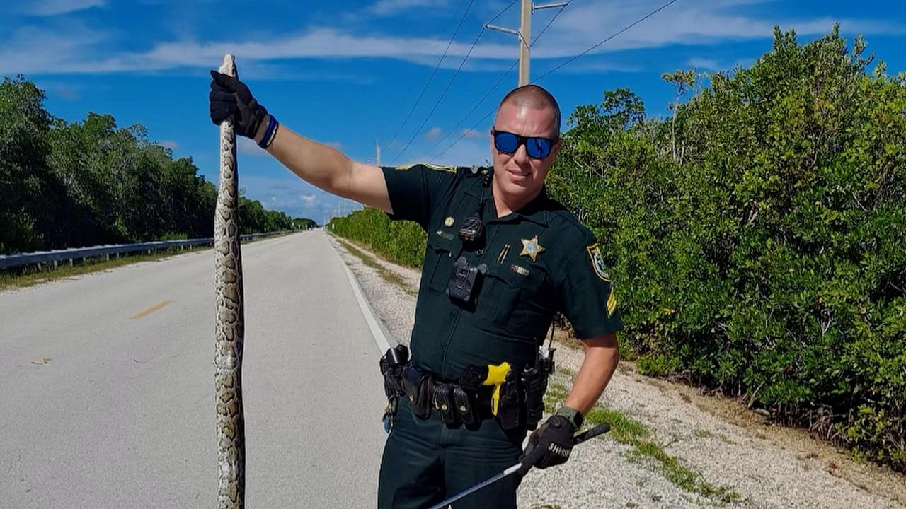 El sargento James Hager se topó con esta piton birmana en Los Cayos de Florida, estaba en el medio de la US 1, a nivel de Key Largo. Por suerte, el oficial la capturó, pero debe tener cuidado, pues suelen llegar a esta zona desde los Everglades, por Florida Bay.