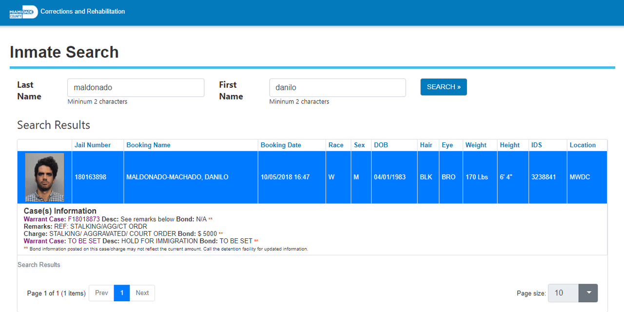 En el sitio oficial de correccionales y rehabilitación del condado de Miami-Dade informa que la orden de su caso es F18018873 y tiene una fianza de 5,000 dólares. Maldonado podría enfrentar hasta 5 años de prisión, mas 5 años con estatus probatorio, en caso de ser hallado culpable.